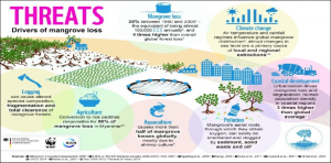 Despite their value, mangroves face significant threats from human activity and environmental change, as outlined in the diagram below. Nearly 50% of mangrove-associated mammals face extinction, and between 20 and 35% of the world’s mangroves have disappeared since 1980.