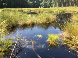 Mire restoration and reintroduction site for White-faced Darter Leucorrhinia dubia. An example of an ecological restoration project with both habitat and species objectives, managed by Cheshire Wildlife Trust. Dolittle Moss, Delamere Forest, Cheshire, 31 July 2020. © David Parker.