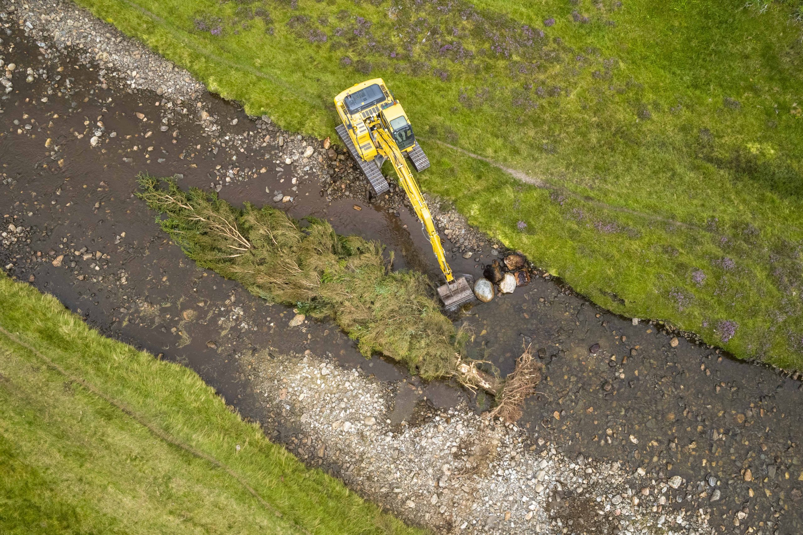 The first phase of the project, completed in 2020 and 2021, focused on revitalizing the river channel itself. Historically, the Calder’s habitat had become too uniform, lacking the gravel beds, pools, and riffles essential for a thriving freshwater ecosystem. To address this, 29 Large Woody Structures (LWS) were installed along 1.6 km of the river. These structures, crafted from locally sourced trees with root balls intact, were embedded into the riverbed and banks to mimic natural deadwood. The result? A more dynamic channel that encourages sediment deposition, flow diversity, and habitat complexity—key ingredients for supporting fish at every stage of their life cycle.